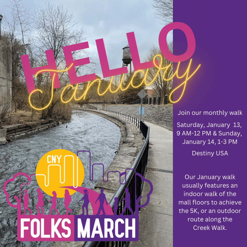 Once again, we will hold our first Folksmarch of the year at the centrally located mall: Destiny USA. January weather is unpredictable in our area. We may have a relatively warm winter day for Folksmarchers to walk outside along the Inner Harbor and a portion of the Creek Walk which is a short distance from the mall entrance on Hiawatha Blvd. Others may choose to see what’s new inside the mall by walking the perimeter of the 4 retail floors in order to complete a 5k.