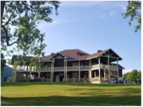 As you enter the park grounds, go past the theatre that will be on your right; go straight down the road for a very short distance and over the bridge. You will see a playground on your left and Pavilion 1 will be kitty-corner on your right.